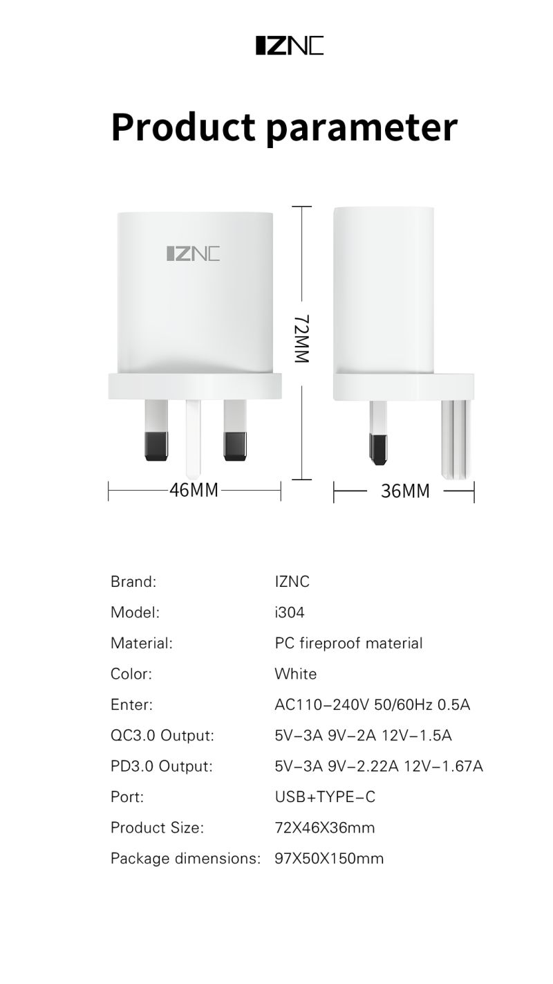 Whether you own a smartphone, tablet, or any other USB-enabled device, the i301/I303/i304 are the ultimate solution for all your charging needs. With its PD20W fast charging, A+C output port, and compatibility with QC3.0 fast charging protocol, this charger offers unparalleled versatility. You can charge multiple devices at the same time without sacrificing speed or performance.