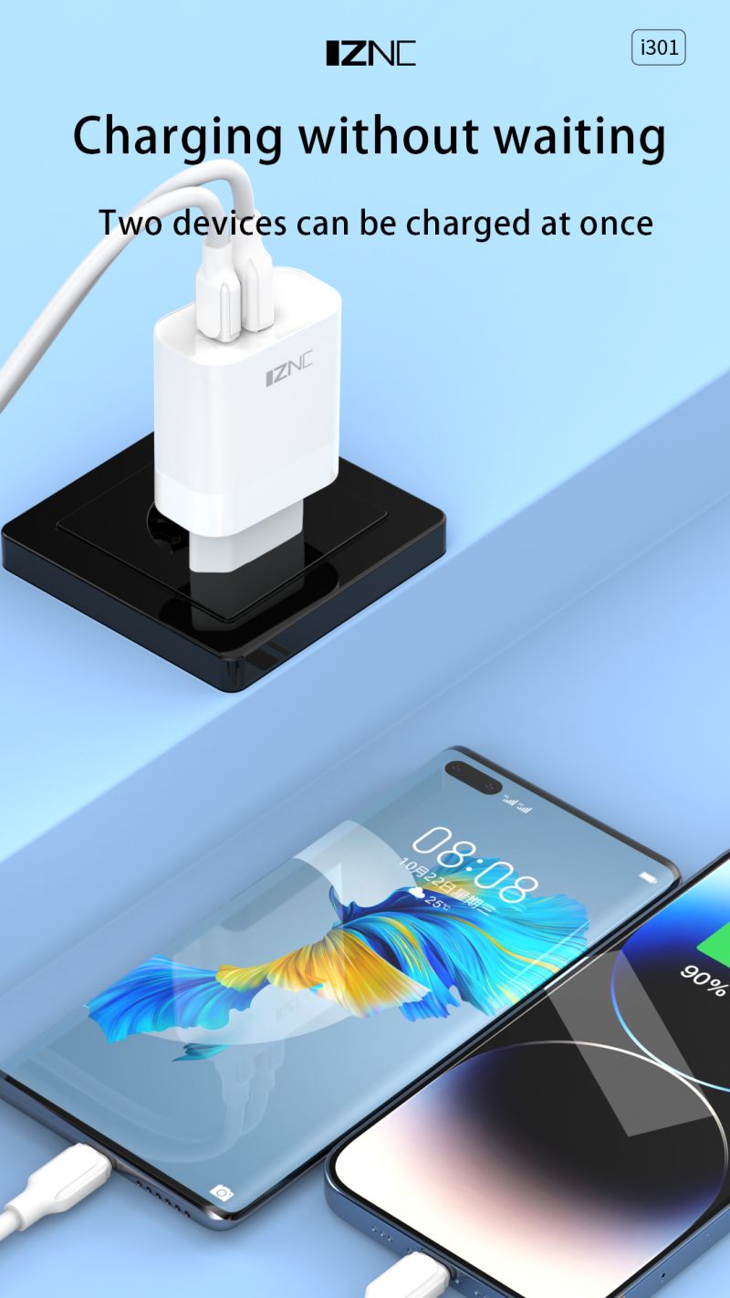 The i301/I303/i304 A+C Wall Charger is a cutting-edge charging accessory that combines advanced technology, superior performance and stylish design. With its stunning white color and compact size, this charger is not only functional but also adds a touch of elegance to any space.