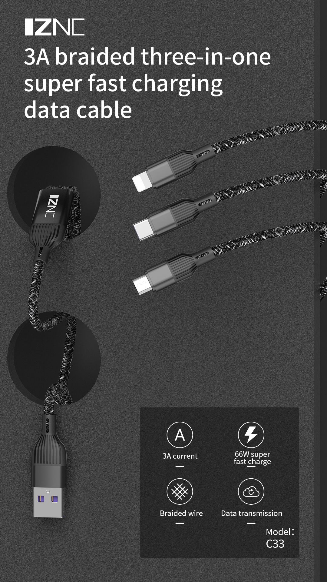 This multi charging cable with 3 different USB ports, including for Lightning, Micro USB and USB C connectors. Support to charger most of the mobile phones available on market.