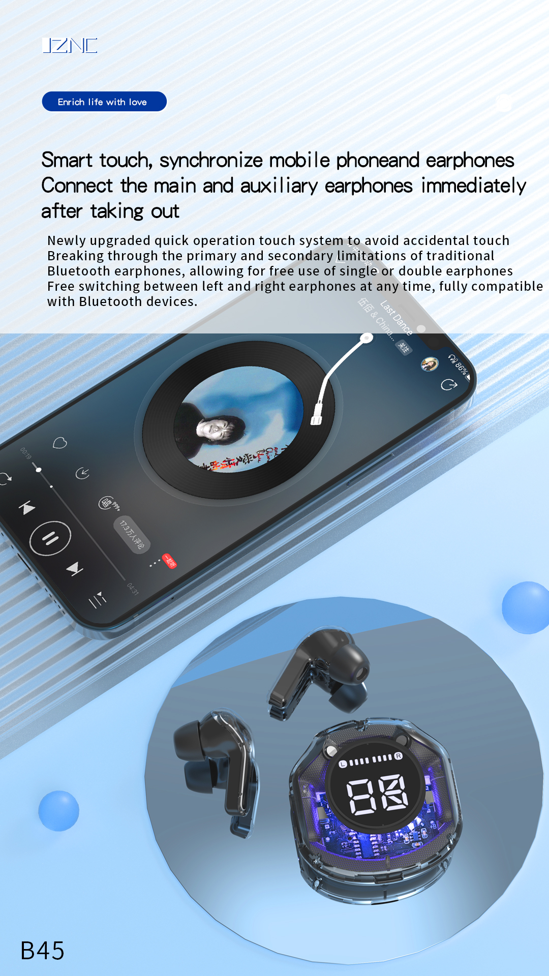 The B45 features a battery-powered digital display and a suspended breathing light effect, adding a touch of modernity and style to your listening experience. Stay informed about your battery level and enjoy an attractive light display while listening to your favorite music.